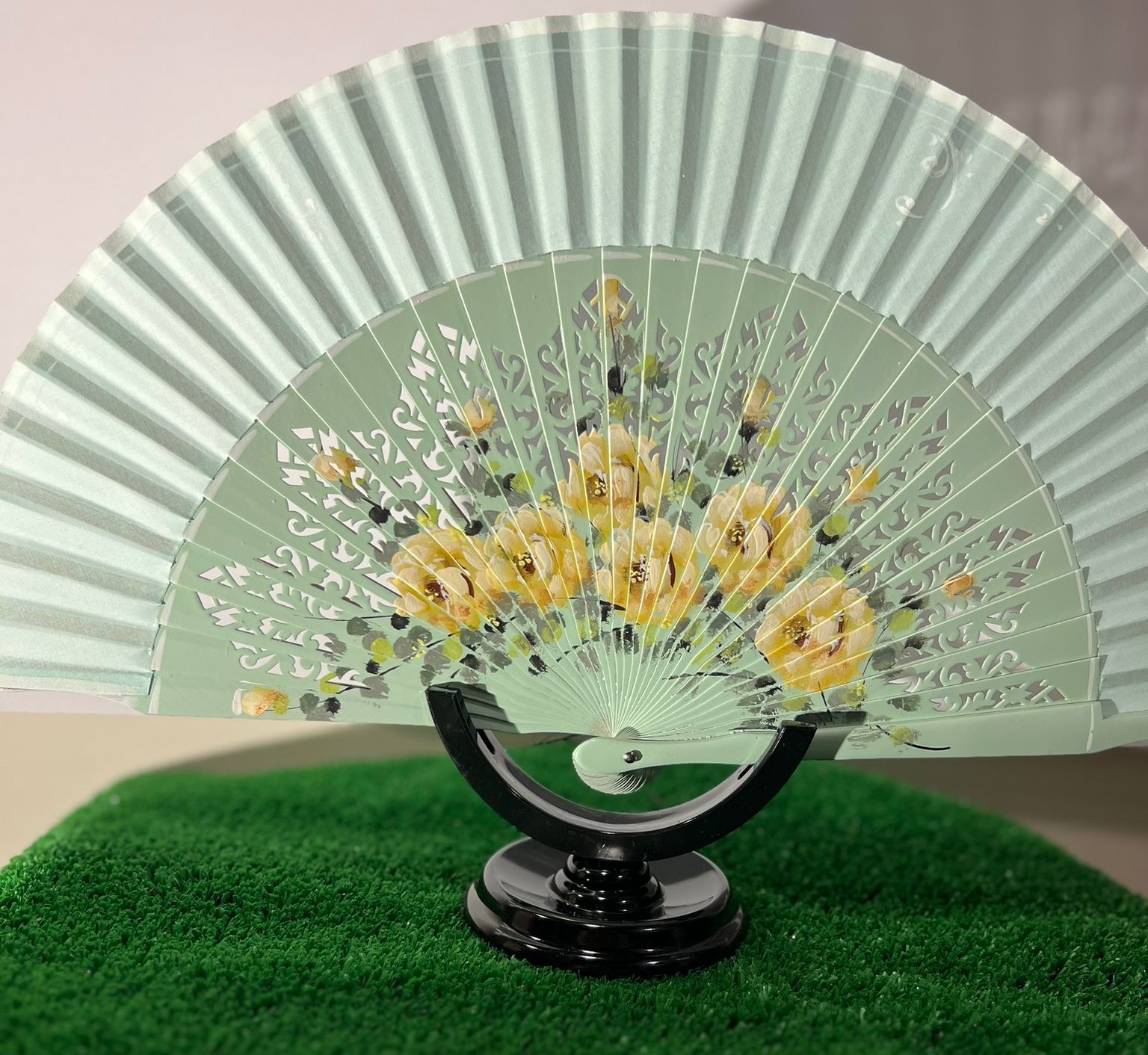 Abanico de 41 x 22 cm en tono verde menta con flores amarillas pintadas a mano y detalles calados en las varillas.