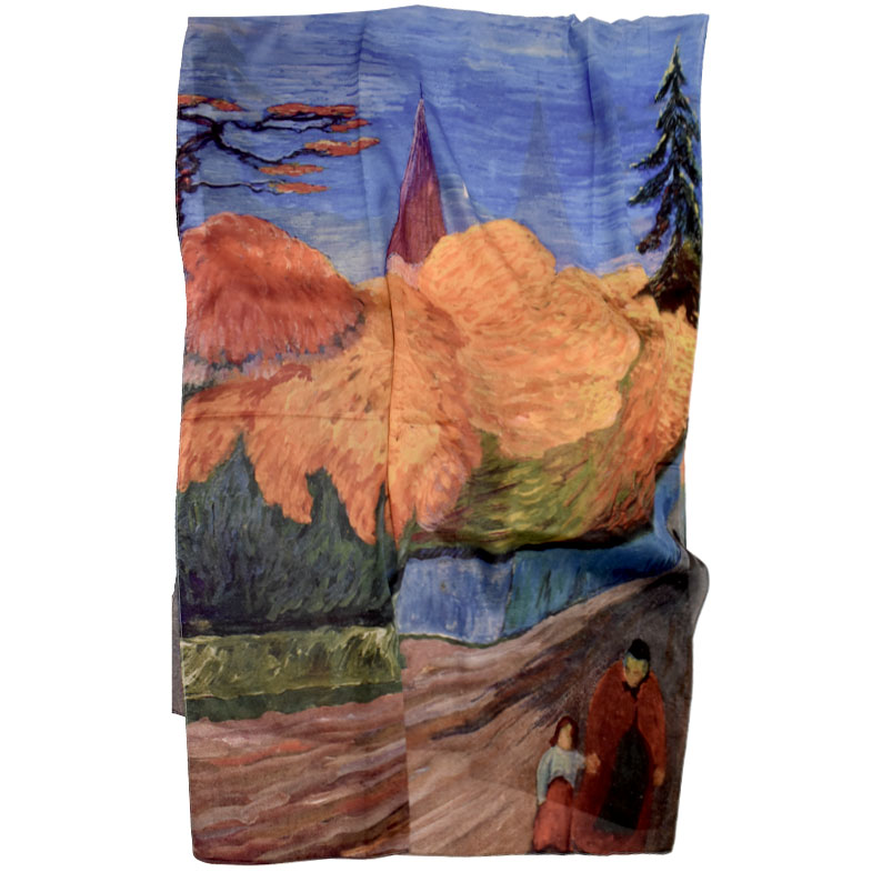 Pashmina en seda inspirada en Arte en tonalidades azules y rojizos.